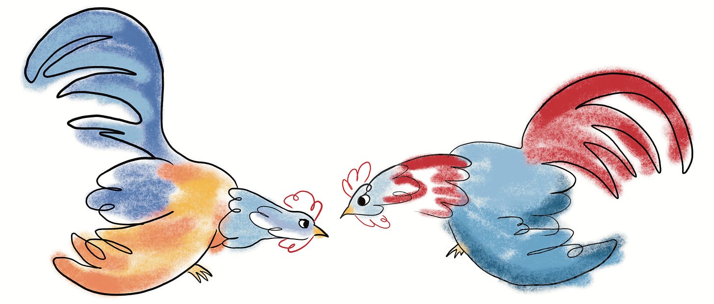 Before we get into the subject of playing chicken, or even playing with chickens, literally or metaphorically, I’d like first to talk about the Gallus Gallus Domesticus itself; and about the relationship between humans and chickens which is, well, complex to say the least, dating back at least 10,000 years.
