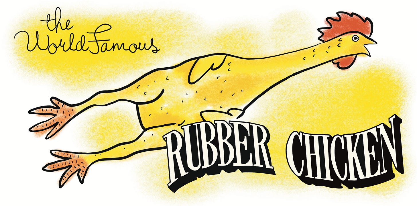 Perhaps it’s precisely because it had been held in such high esteem that using a floppy facsimile of a denuded rooster as a weapon seems so ridiculous, and therefore irreverent and therefore funny; certainly funny enough for the novelty company, Loftus International, to have sold many millions of what it claims to be ‘The Original’, ‘ WORLD FAMOUS’, ‘realistic’ rubber chicken.