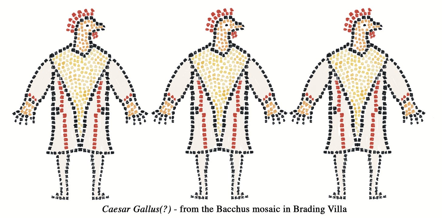 It has been suggested that this very puzzling mosaic in Brading Villa on the Isle of Wight was commissioned by Palladius, a high ranking bureaucrat exiled to Britain in AD361 from his native Antioch, and that the figure of a person with the head and feet of a chicken is a lampoon of the man who banished him; one Caesar Gallus.