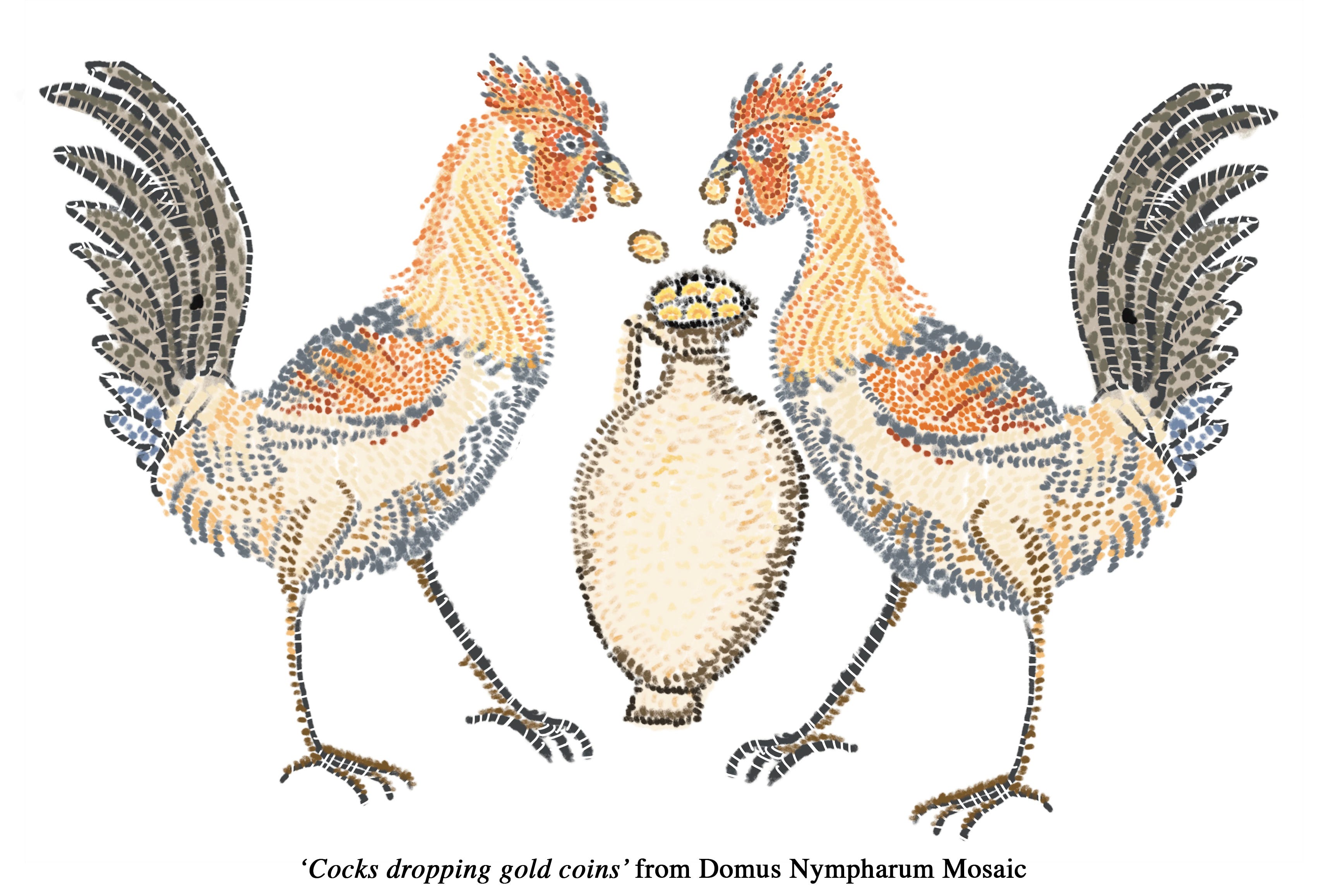 Most, if not all, experts agree that the presence of the piper indicates that it likely depicts a scene from Aristophanes’ satirical comedy, The Birds, which was first produced at the City of Dionysia in 423BC. Two men dressed as fighting cockerels and representing The Old and The New Ideas conduct a furious debate about the growing belief that civilized society was not a gift of the gods but rather had developed gradually from primitive man’s animal-like existence.