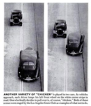 Anyway, it is both the chicken as coward and the fearless, unyielding fighting cock that are being evoked when Playing Chicken, a game that came to fame, in fact achieved notoriety, in 1950s America.