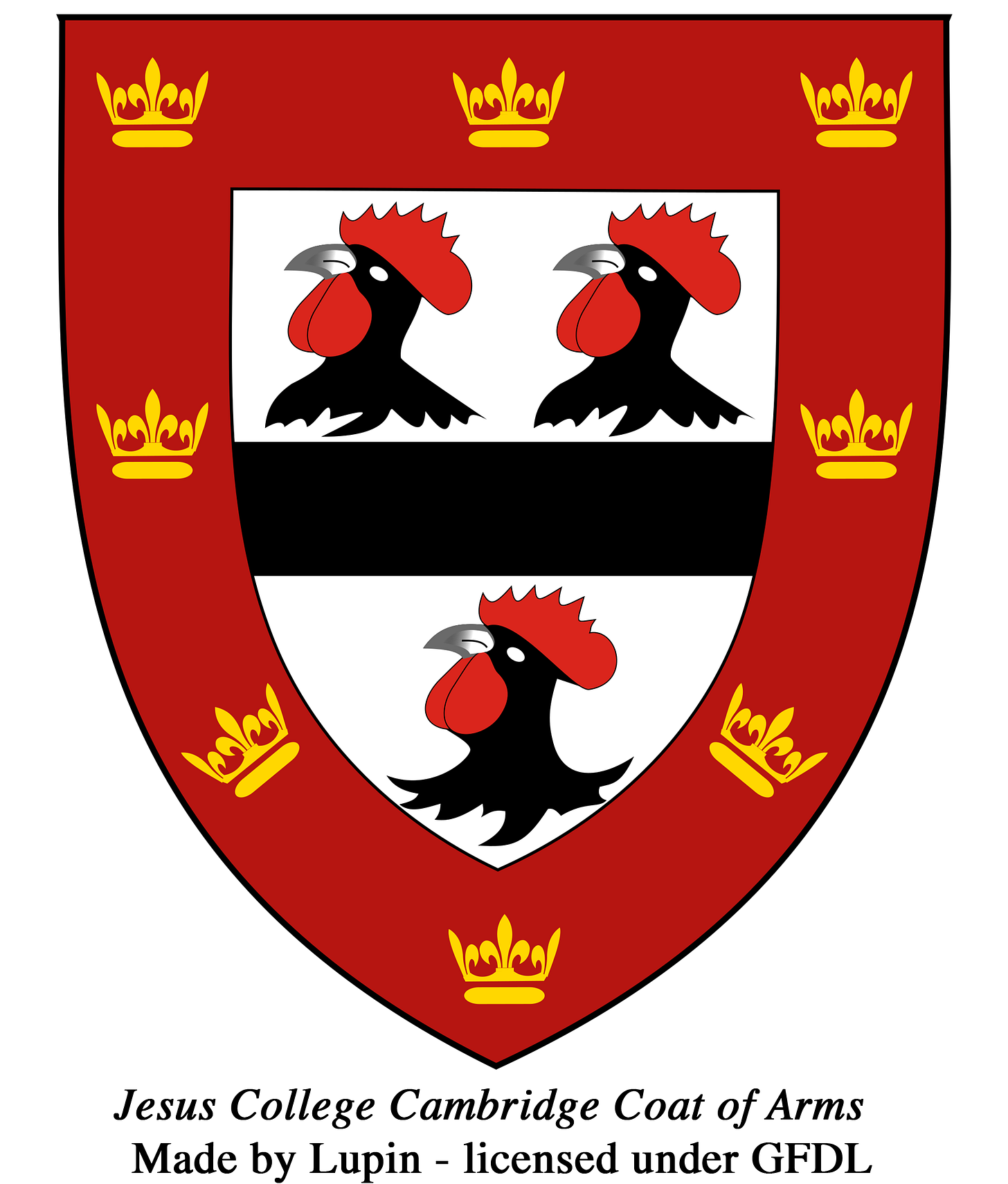 Jesus College Cambridge was founded by Bishop John Alcock in 1496 and the college crest shows the arms of the Alcock family in which the cockerels are heraldic bearings called canting arms – in other words, visual puns – in this case, a play on the word ‘cock’.