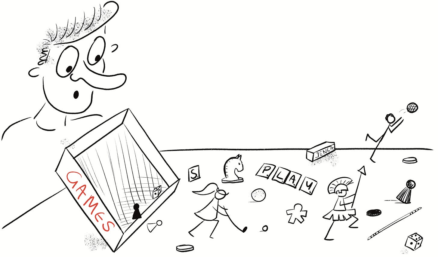 So, it isn’t at all easy to define game, beyond saying that, in this one sense of the word, it means something designed specifically to be played, which is hardly enlightening given how challenging it is to define what we mean by play itself.